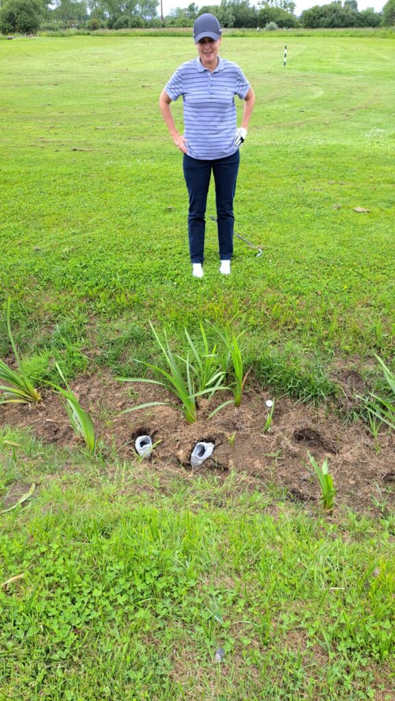 Sa balle s’est posée au bord d’un petit ruisseau sec… ou presque. En prenant position pour imaginer le coup à jouer, pour ensuite aller chercher le club adapté, elle a vu ses chaussures restées pluggées !!